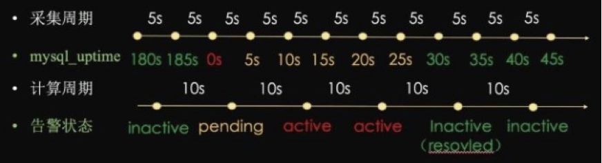 用一个简单的例子来理解一下,以下配置一个mysql的告警,该指标的采集周期是5s一个样本点,配置了规则策略是每10s计算一次,当运行时小于30s则触发告警状态。