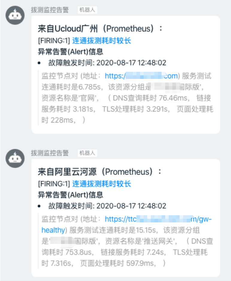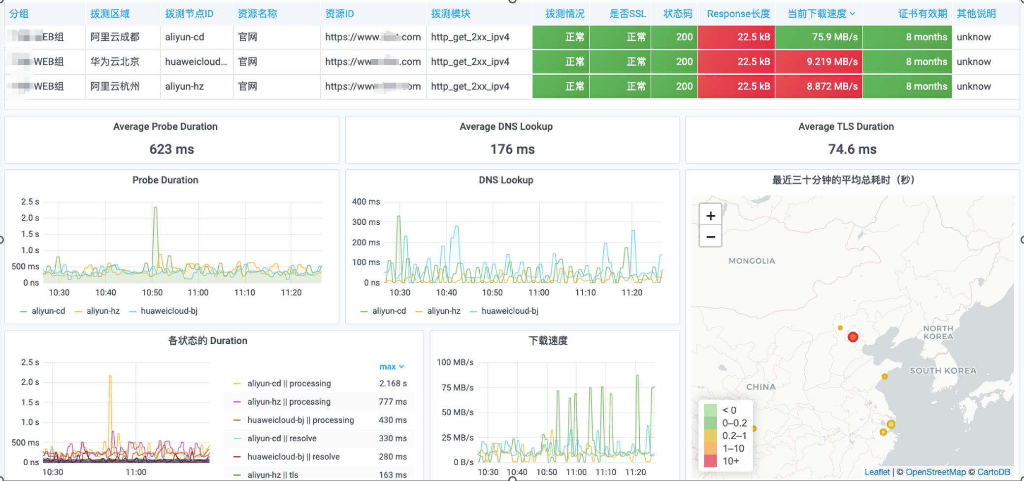 - ⽀持对公司前端服务的证书链,DNS耗时,TLS耗时,⾸次建⽴建⽴耗时,加载完成耗时等监控