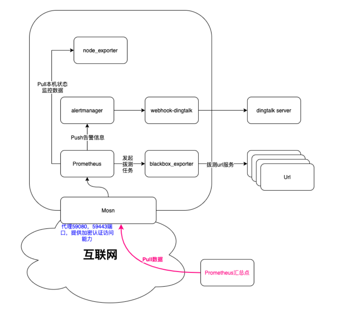 - 拨测点需要在全国各地布点,在管理上难度较⼤,特别在兼顾拨测任务分发、拨测监控数据回收统 ⼀展⽰、告警聚合收敛的同时,还要考虑安全和应对审计等问题。架构的设计上需要严格控制 PULL和PUSH的数据流,还要和现有的采集监控系统独⽴出来。所以引⼊了Mosn做⽹格管理来降 低管理成本。
