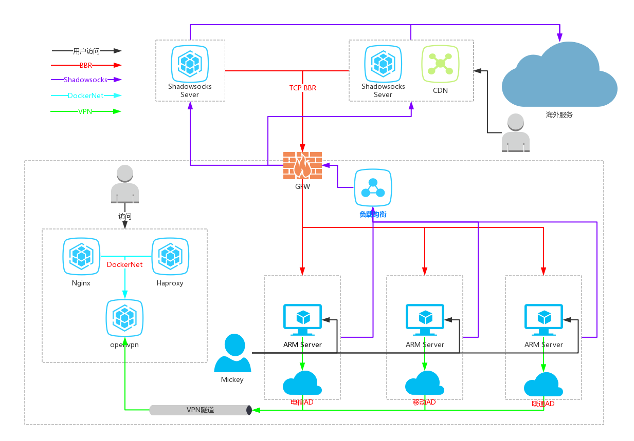 管理复杂网络内的系统,有时候需要突破网络限制.有比较多的方案,比如ss5,Shadowsocks,vpn等. 这里提供一种方案是利用 docker-openvpn 实施多重复杂网络内的主机互联,实现利用nginx反向代理各类服务.